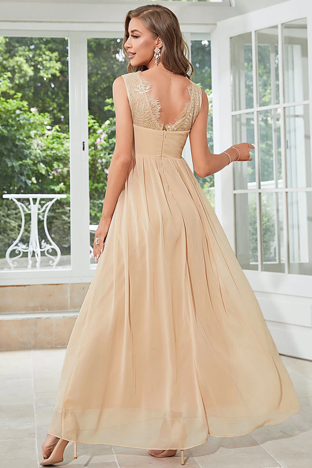 Abricot Chiffon Robe Longue D’invité De Mariage Avec Dentelle