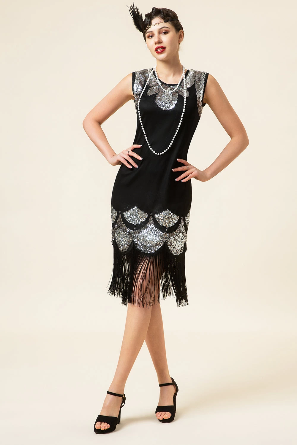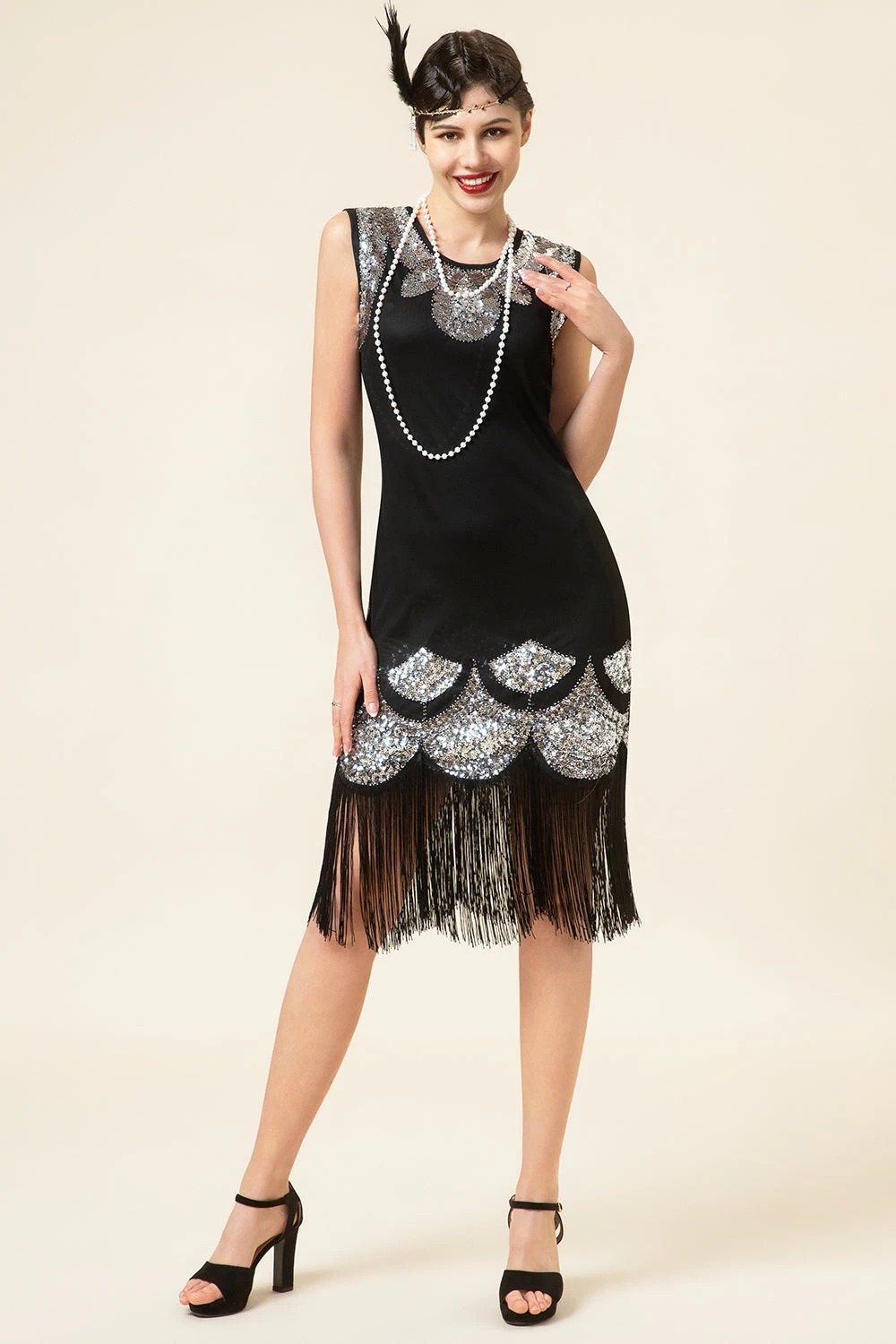 Noir Et Argent Franges à Paillettes Années 20 Robe Gatsby Flapper Avec 20s Accessoires Set