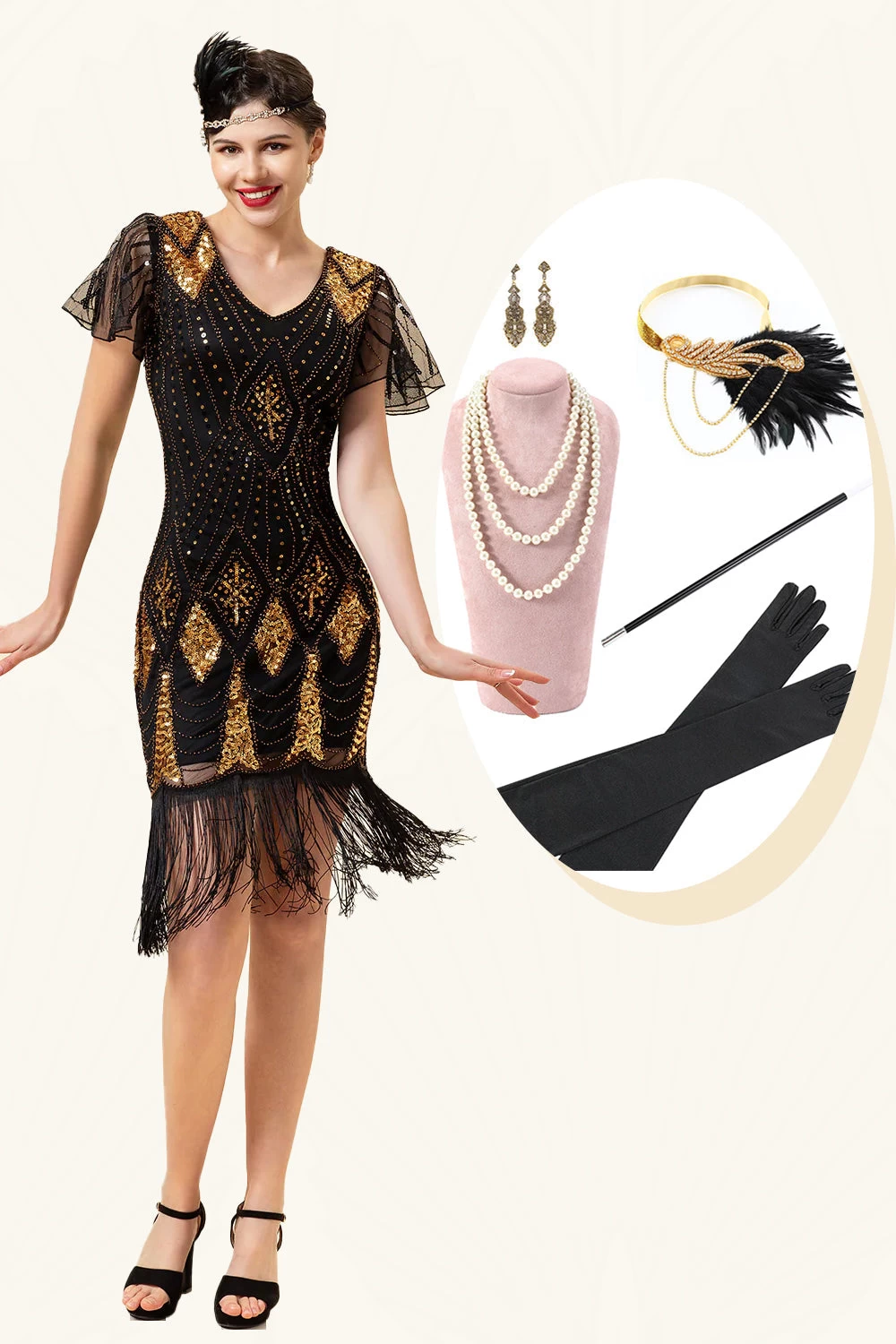Noir Et Paillettes Dorées Franges Robe Gatsby Des Années 20 Avec 20s Accessoires Set