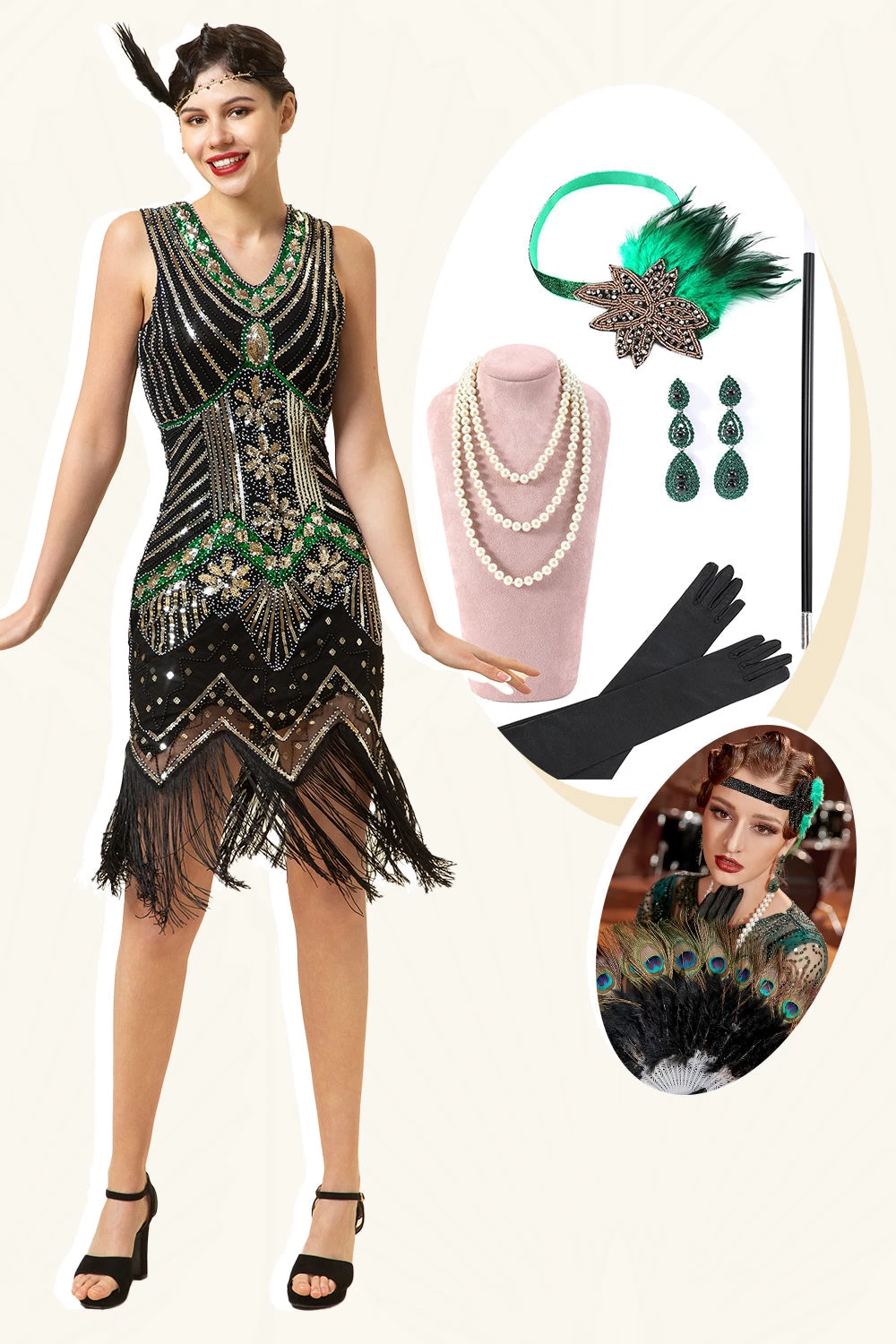 Paillettes Vert Noir Franges 1920s Gatsby Robe Avec 20s Accessoires Set