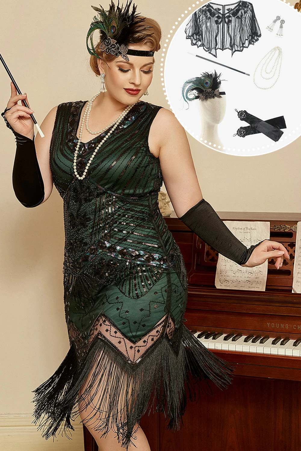 Robe à Paillettes Vert Foncé Des Années 20 Avec Ensemble D’accessoires