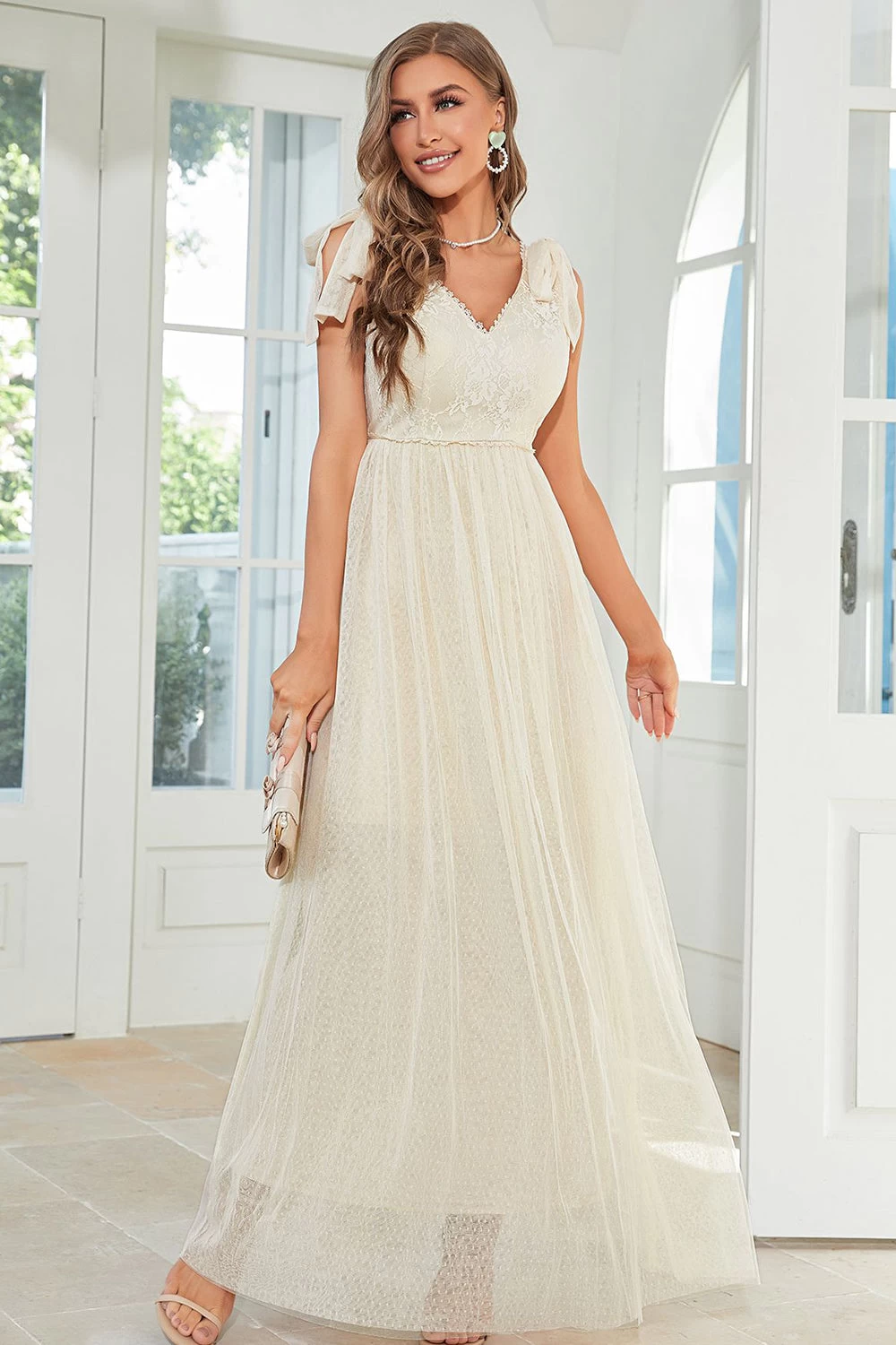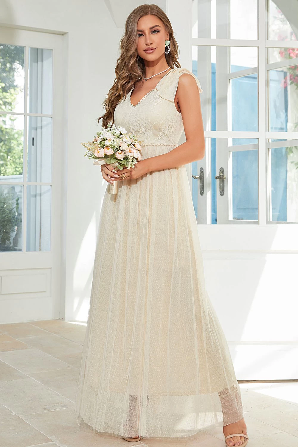 Robe D’invité De Mariage Longue En Dentelle D’abricot Avec Nœud Papillon