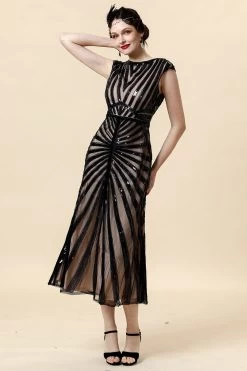 Robe à Paillettes Noires Glitter Midi Flapper Avec Ensemble D’accessoires Des Années 20