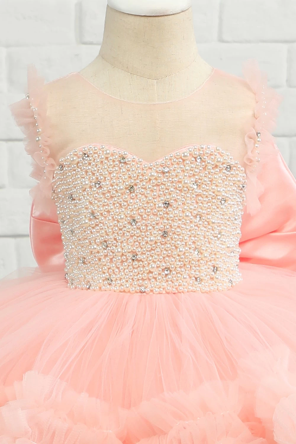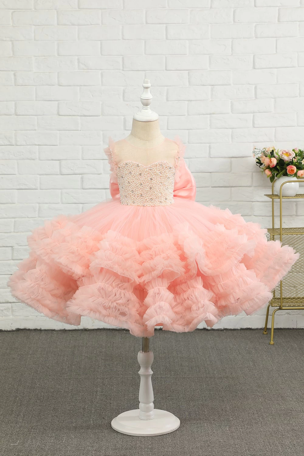 Rose Perles Tulle Fleur Fille Robe Avec Nœud